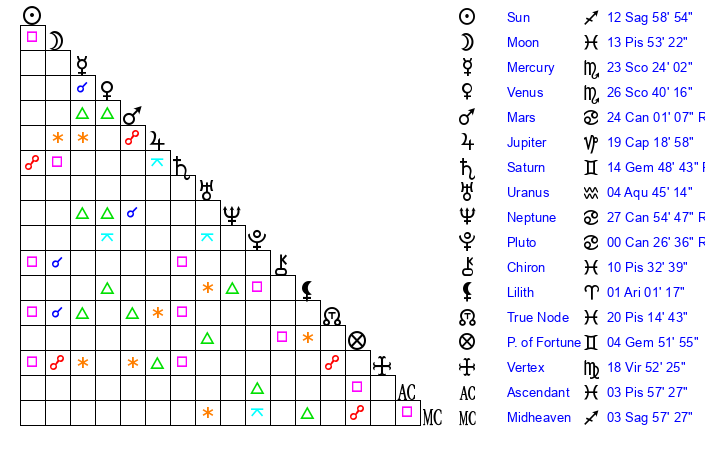 | Moon | 13 Pisces 59 | 24 Gemini 18 | 16 Aries 25 |