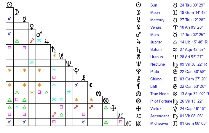 | Sun | 24 Taurus 9 | 25 Taurus 7 | 21 Leo 11 |