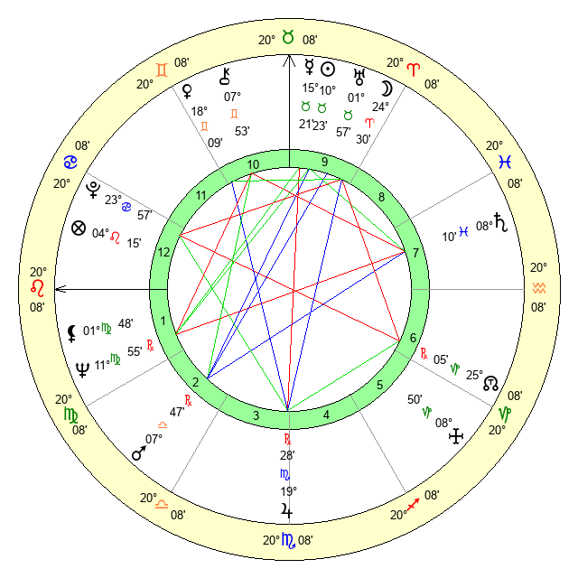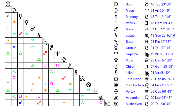 | Sun | 10 Taurus 23 | 11 Taurus 34 | 6 Leo 35 |