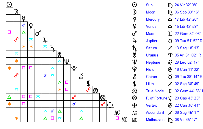 | Sun | 24 Virgo 32 | 25 Virgo 3 | 1 Capricorn 39 |
