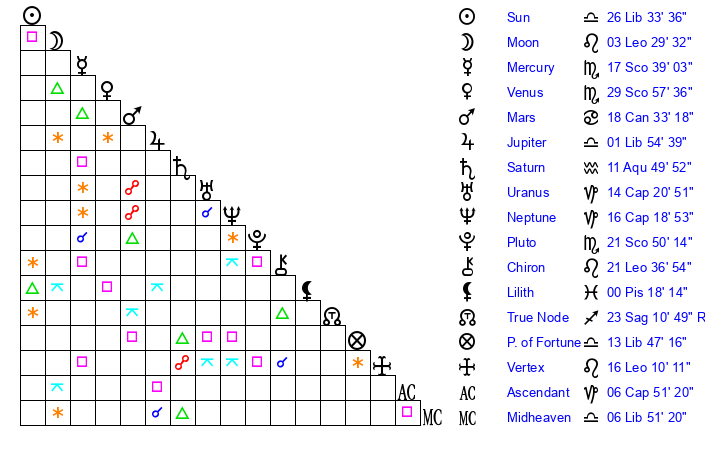 | Moon | 3 Leo 24 | 6 Libra 28 | 25 Libra 21 |