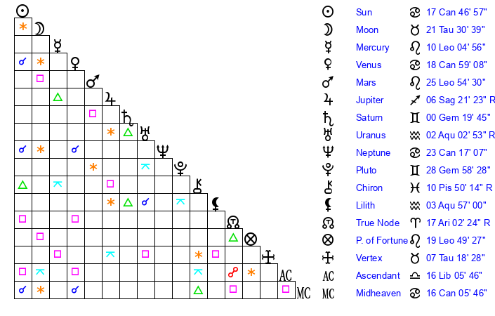 Moon | 21 Taurus 24 | 13 Capricorn 47 | 15 Cancer 16 |