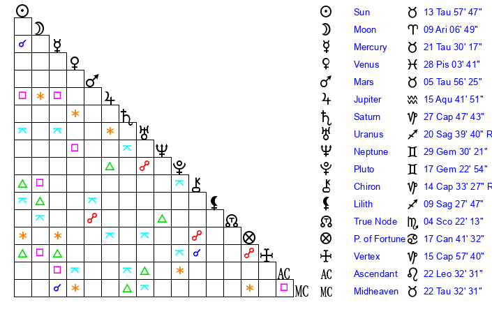 | Pluto | 17 Gemini 23 | 3 Aquarius 48 | 19 Gemini 40 |