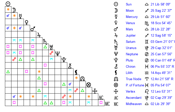 Sun | 21 Libra 58 | 22 Libra 35 | 16 Aquarius 19 |