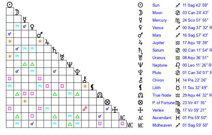 | Neptune | 0 Leo 11 | 27 Pisces 7 | 27 Cancer 43 |