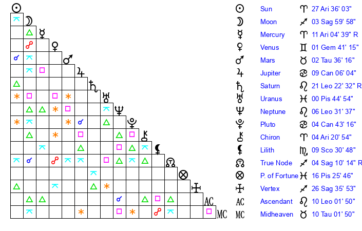 | Sun | 27 Aries 36 | 28 Aries 54 | 9 Leo 19 |