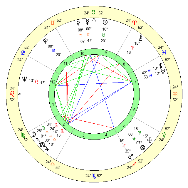 | Moon | 28 Virgo 42 | 22 Virgo 58 | 28 Gemini 54 |