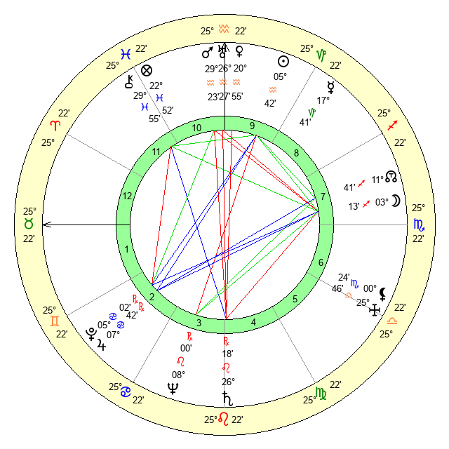 | Sun | 5 Aquarius 42 | 7 Aquarius 0 | 20 Taurus 54 |