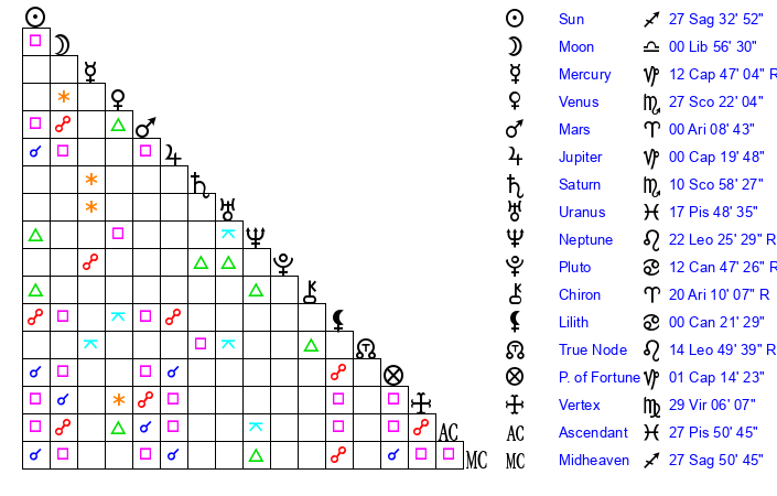 | Venus | 27 Scorpio 22 | 14 Aquarius 12 | 1 Aries 58 |