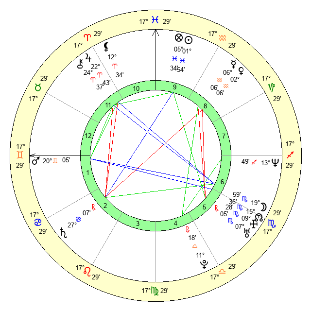 | Sun | 1 Pisces 54 | 3 Pisces 1 | 20 Aries 39 |