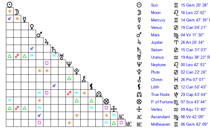 | Mercury | 14 Gemini 46 | 24 Gemini 45 | 20 Libra 42 |