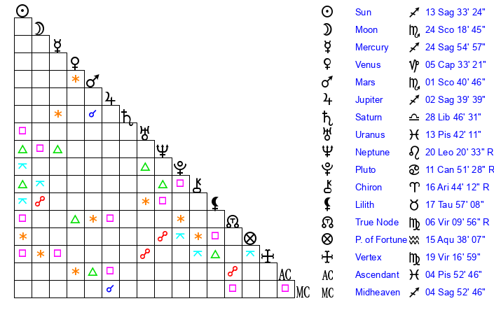 | Sun | 13 Sagittarius 33 | 15 Sagittarius 4 | 25 Pisces 50 |