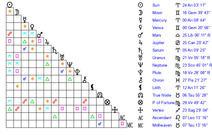 Sun | 24 Aries 3 | 25 Aries 0 | 20 Gemini 5 |