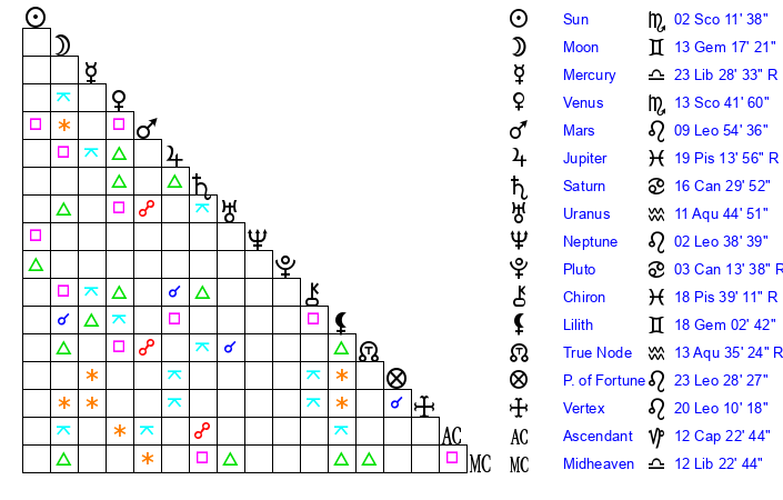 | Sun | 2 Scorpio 11 | 3 Scorpio 32 | 23 Aquarius 41 |
