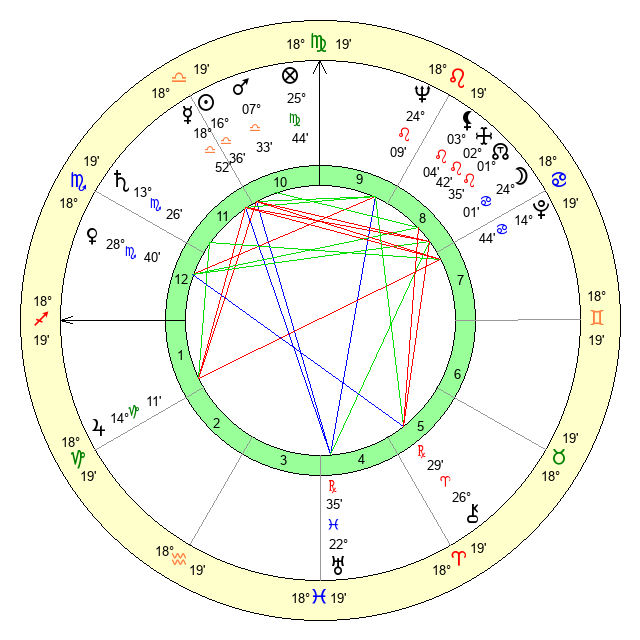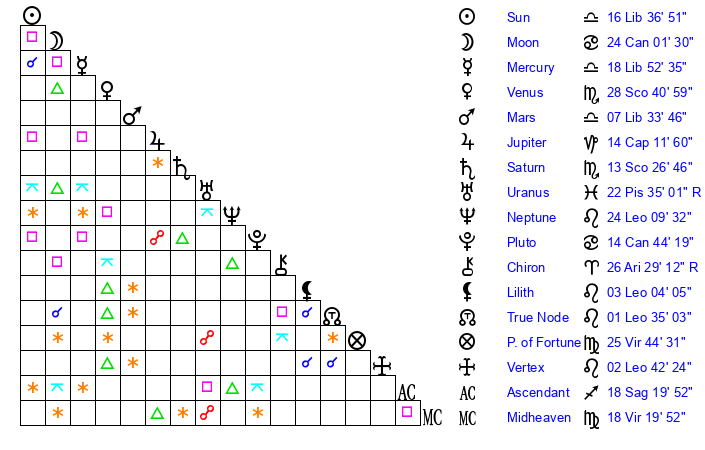 | Saturn | 13 Scorpio 56 | 26 Pisces 57 | 24 Scorpio 45 |