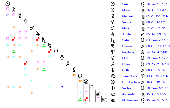 Sun | 26 Leo 18 | 26 Leo 58 | 18 Sagittarius 18 |