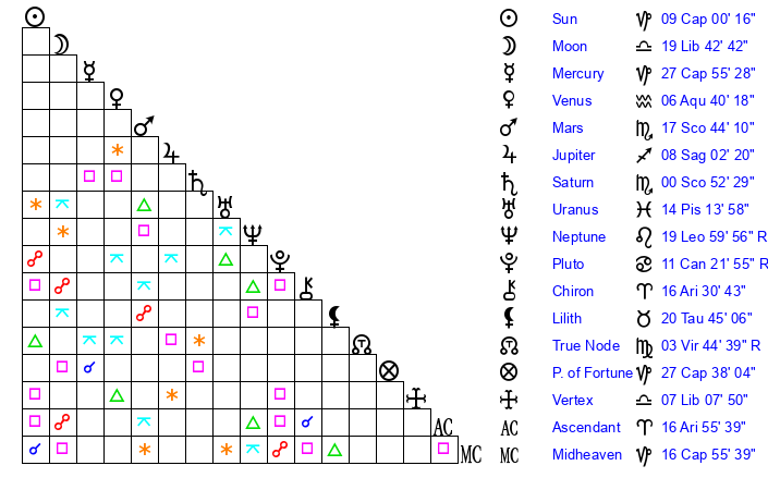 | Moon | 19 Libra 47 | 19 Capricorn 58 | 0 Cancer 58 |