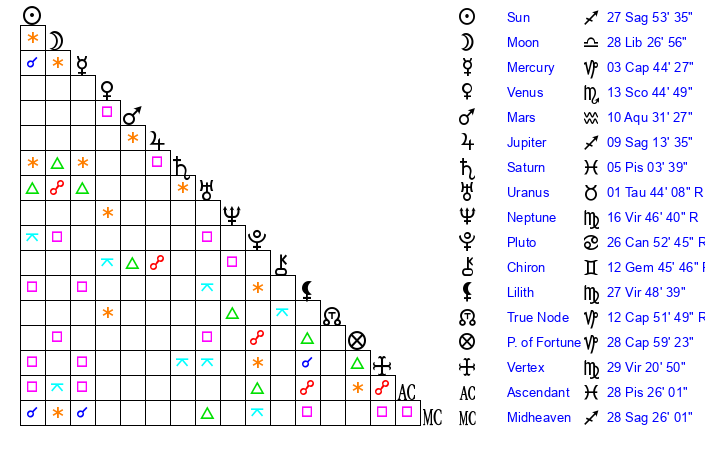 | Sun | 27 Sagittarius 53 | 29 Sagittarius 4 | 28 Pisces 55 |