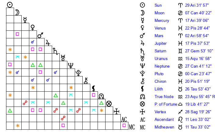 | Sun | 29 Aries 31 | 0 Taurus 52 | 15 Leo 2 |