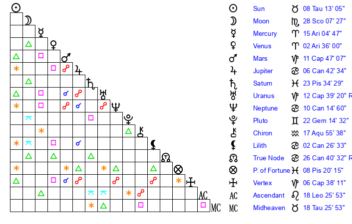 | Sun | 8 Taurus 13 | 9 Taurus 38 | 1 Virgo 19 |
