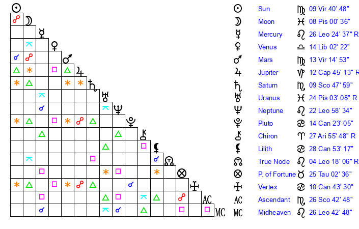 | Neptune | 22 Leo 58 | 1 Aries 18 | 24 Leo 44 |