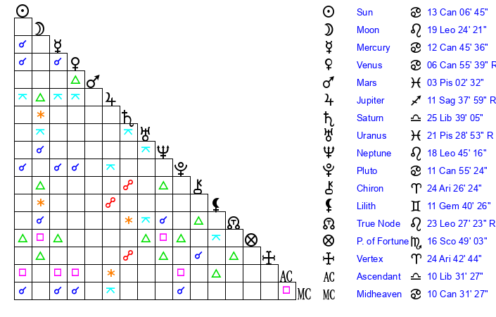 | Venus | 6 Cancer 55 | 0 Gemini 54 | 7 Virgo 44 |