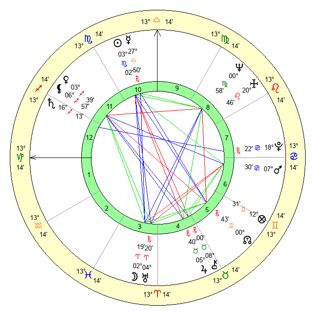 | Neptune | 0 Virgo 59 | 29 Pisces 53 | 0 Virgo 31 |