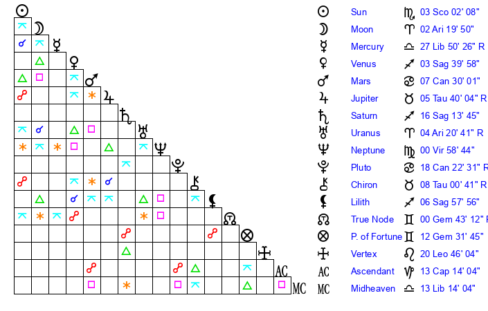| Sun | 3 Scorpio 2 | 3 Scorpio 32 | 11 Aquarius 22 |