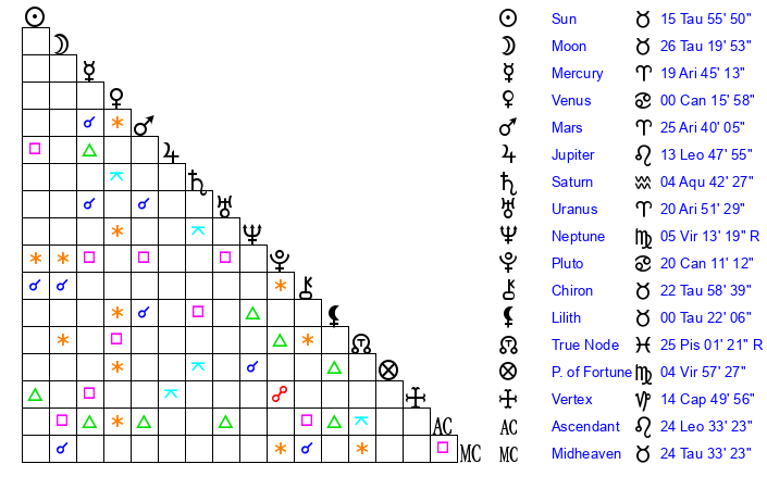 | Moon | 26 Taurus 22 | 10 Virgo 57 | 23 Libra 35 |