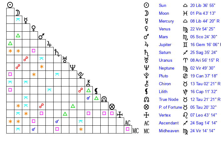 | Neptune | 2 Virgo 50 | 0 Aries 11 | 3 Virgo 5 |