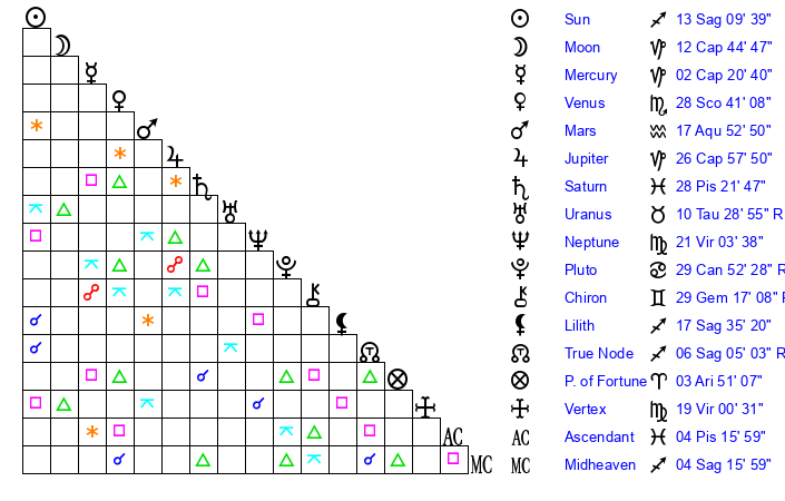 | Sun | 13 Sagittarius 9 | 13 Sagittarius 49 | 12 Pisces 28 |