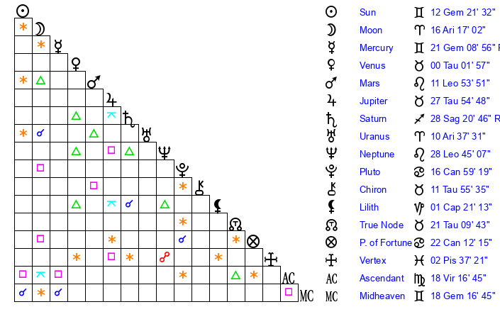 | Sun | 12 Gemini 22 | 13 Gemini 8 | 14 Virgo 19 |