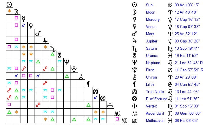 | Moon | 12 Aries 50 | 8 Aquarius 51 | 0 Sagittarius 17 |
