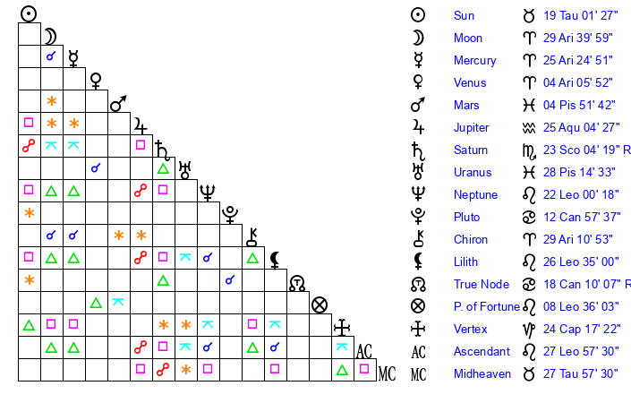 | Uranus | 28 Pisces 15 | 26 Taurus 53 | 28 Pisces 44 |