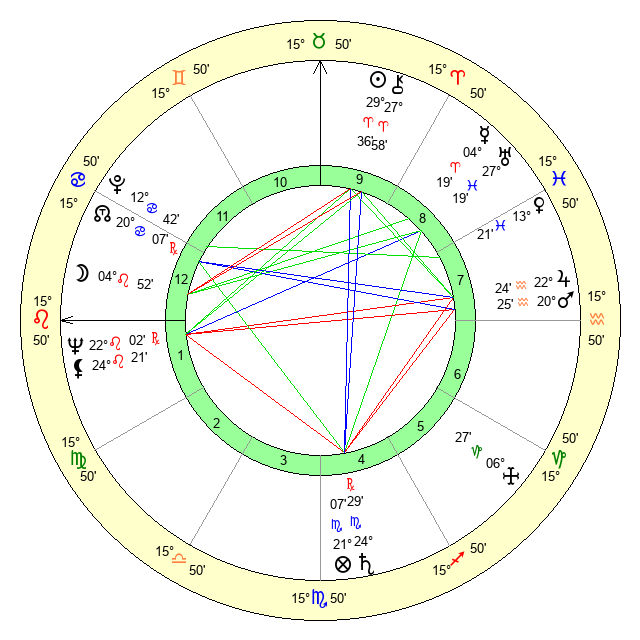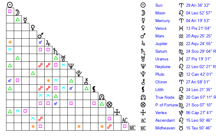 | Sun | 29 Aries 36 | 0 Taurus 37 | 4 Leo 36 |
