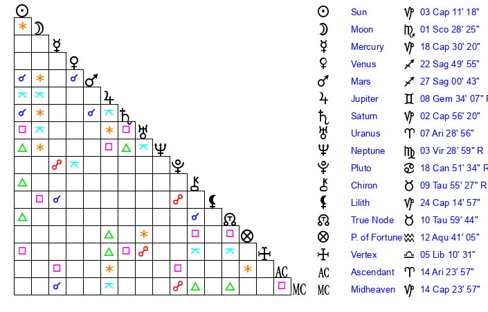 | Saturn | 3 Capricorn 13 | 14 Pisces 0 | 11 Capricorn 45 |
