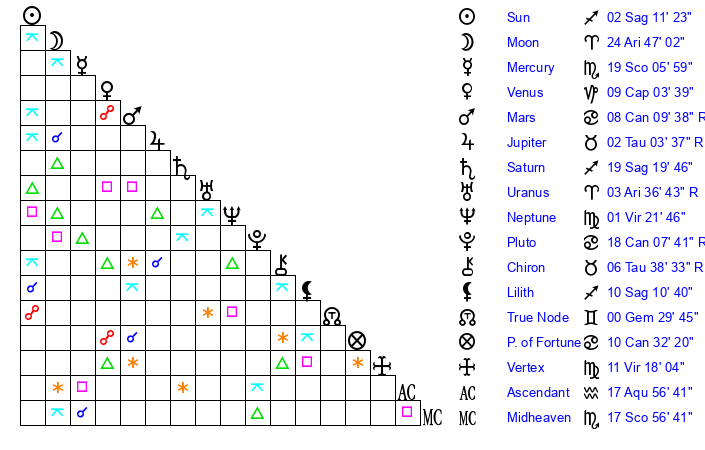 | Moon | 24 Aries 51 | 21 Virgo 2 | 9 Scorpio 17 |