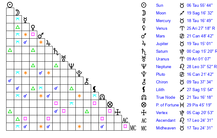 | Moon | 19 Sagittarius 9 | 6 Taurus 15 | 20 Gemini 35 |