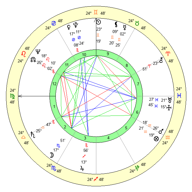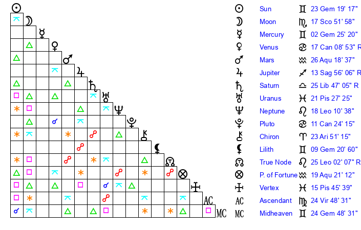 | Sun | 23 Gemini 19 | 23 Gemini 53 | 0 Libra 22 |