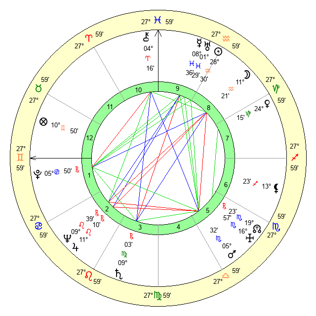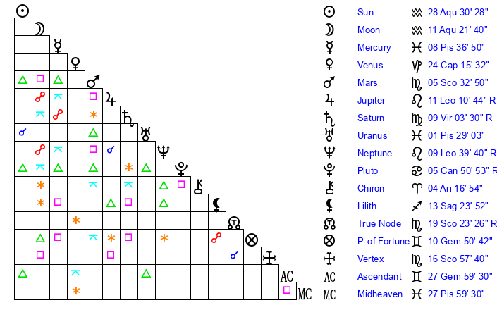 | Sun | 28 Aquarius 30 | 0 Pisces 2 | 11 Gemini 34 |
