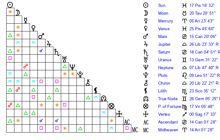 | Neptune | 7 Libra 48 | 29 Pisces 10 | 5 Libra 58 |