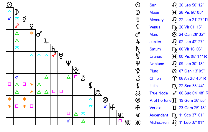 | Neptune | 9 Leo 30 | 1 Aries 44 | 11 Leo 29 |
