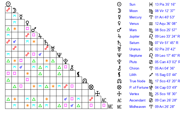| Saturn | 8 Virgo 38 | 21 Pisces 2 | 6 Virgo 56 |