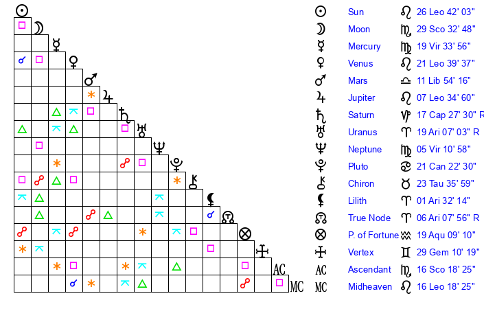 | Venus | 21 Leo 40 | 24 Cancer 4 | 18 Sagittarius 45 |