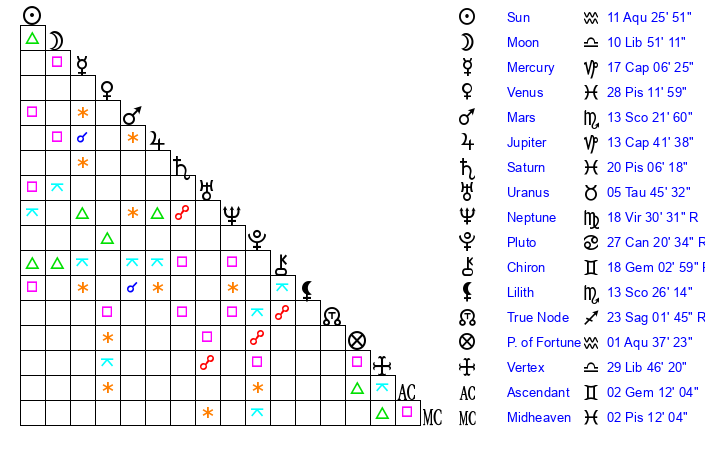 | Sun | 11 Aquarius 25 | 12 Aquarius 4 | 8 Taurus 56 |