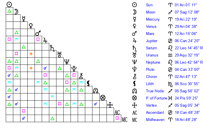 | Mercury | 19 Aries 22 | 6 Aries 13 | 7 Leo 9 |
