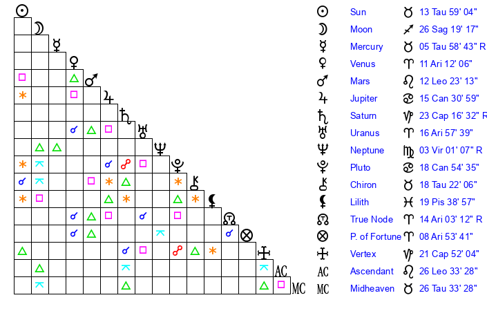 | Sun | 13 Taurus 59 | 15 Taurus 12 | 13 Leo 58 |