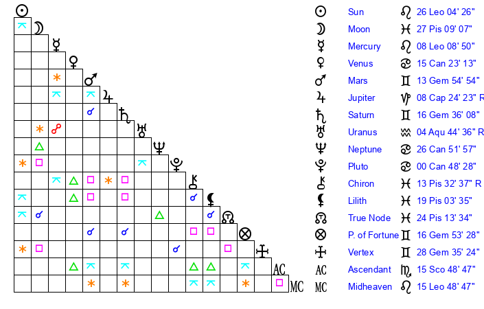 | Moon | 27 Pisces 9 | 12 Cancer 33 | 1 Taurus 25 |