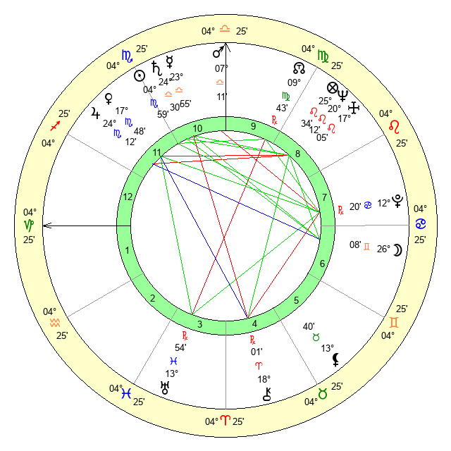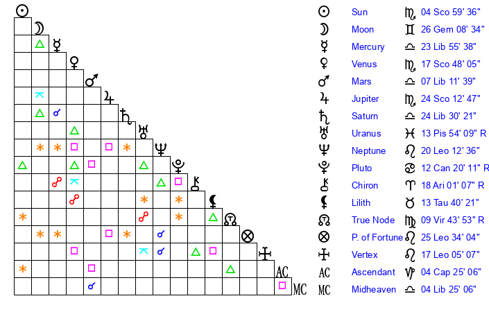 | Saturn | 25 Libra 4 | 25 Pisces 48 | 2 Scorpio 56 |