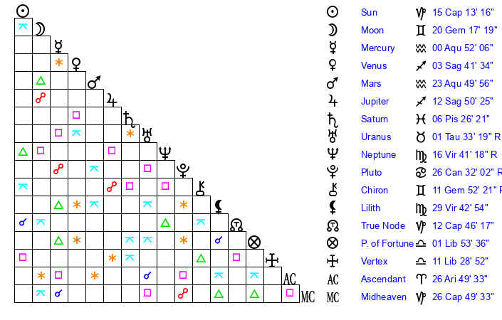 | Pluto | 26 Cancer 31 | 2 Aquarius 53 | 25 Cancer 9 |